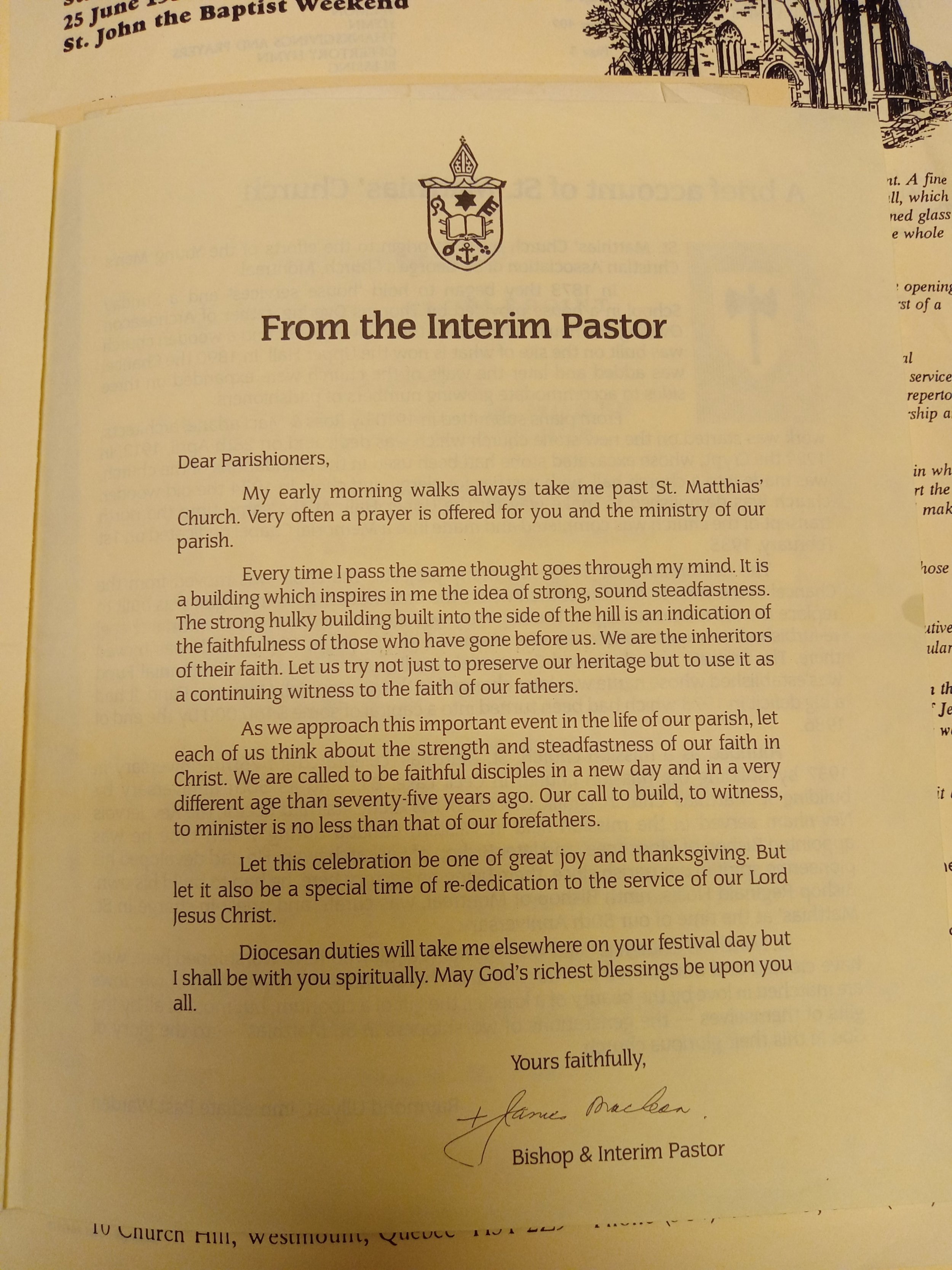 As in many bulletins intended to be keepsakes, this one includes tributes to the St. Matthias’ building from the sitting Bishop of Montreal, from an interim pastor who was also a bishop, and from a past rector. All three tell us something important about the state of the church at the time! Let’s begin with the past rector, who was asked for the second time to contribute remarks despite not being the incumbent (read about his 50th anniversary bulletin remarks here).