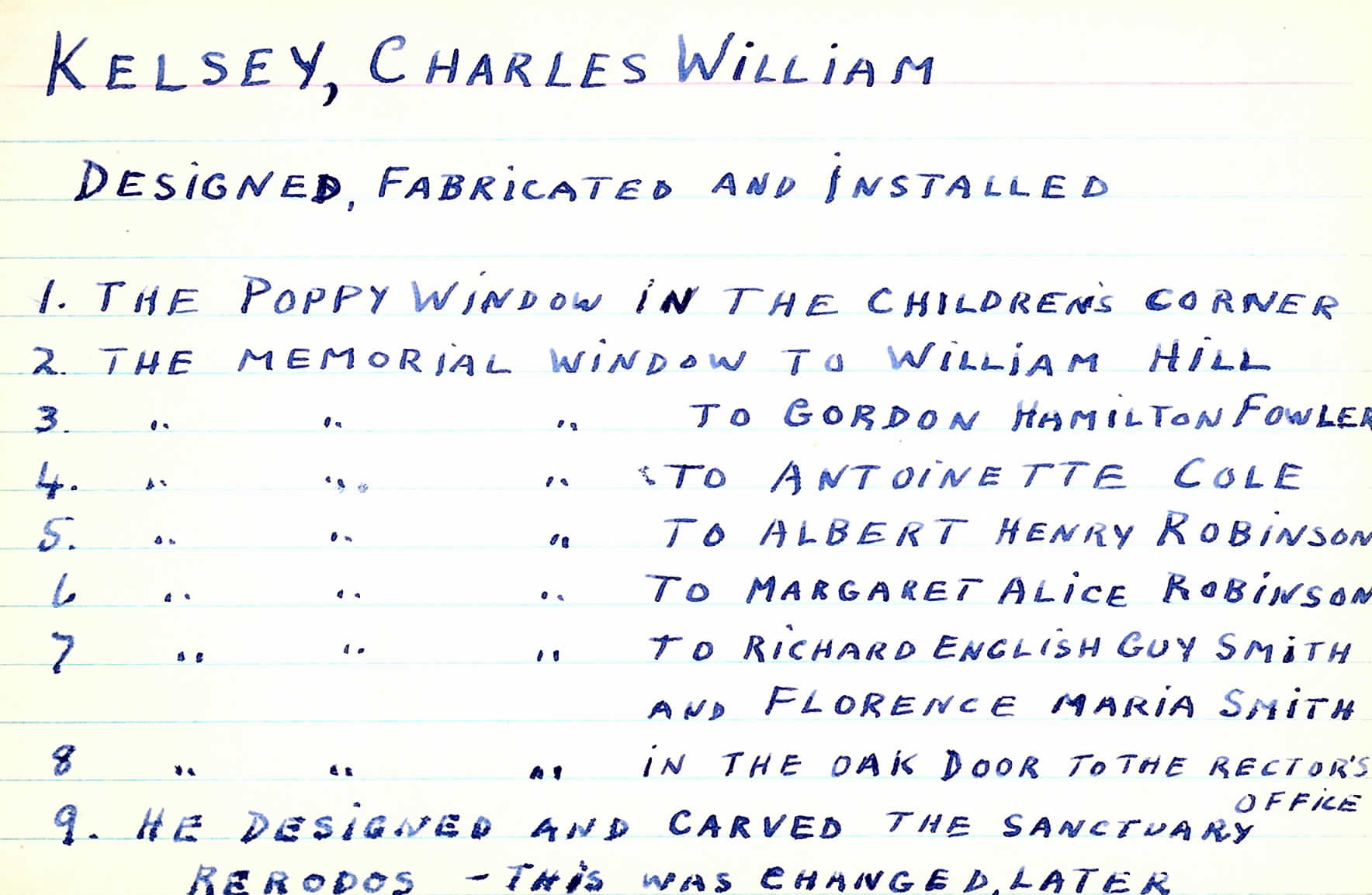 St. Matthias’, like many Protestant churches in Canada, is covered in memorials to dead soldiers, many in their late teens or early twenties. Whether you’ve read a plaque, looked up at a stained-glass window, or taken a moment to peruse the honour roll in the Memorial Chapel, it’s hard to avoid the reminders of what, and whom, this parish lost during the World Wars. The desire to memorialise these boys coincided with two important aspects of St. Matthias’ life from the 1920s through the 1960s: the relative affluence of a settled parish with a large space to decorate, and the move away from what art historian Shirley May Baird calls “prefabricated, uninspired patterns” in stained glass that had been designed in England for mass production. This latter trend was represented, at St. Matthias’, by a parishioner named Charles William Kelsey.