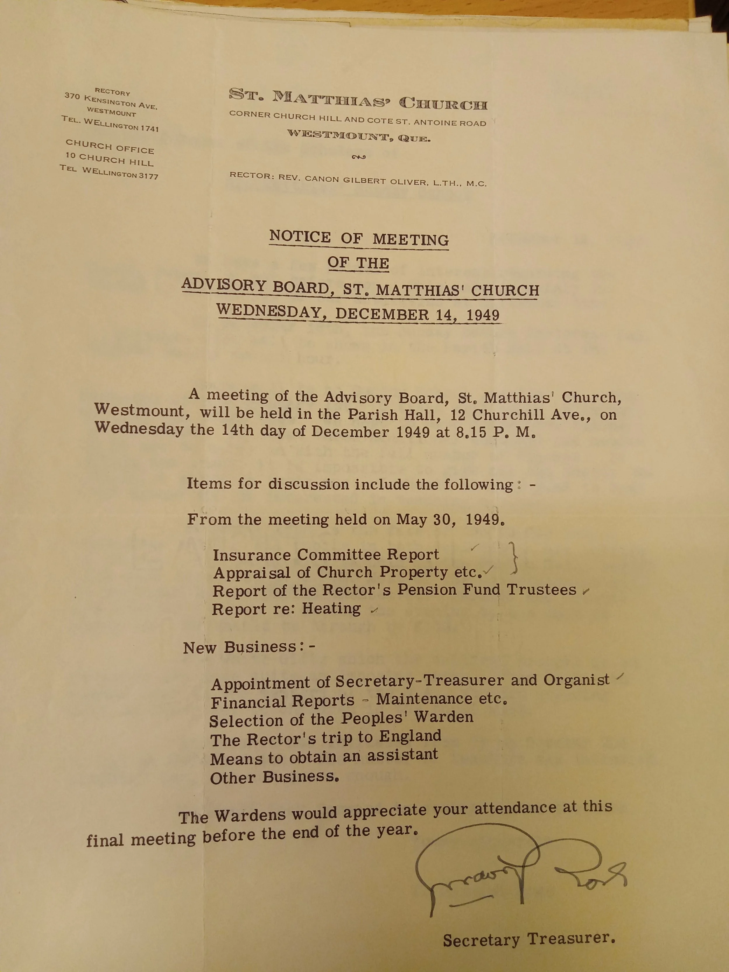 Our archives don’t tell us when St. Matthias’ established a Parish Advisory Board, but by the 1940s it had swollen in size to a membership of about 50, although many of those did not come to meetings. An agenda from December 1949 tells us that the Board concerned itself with things like insurance, staff sickness, preparations for Vestry, the Rector’s travel, and, of course, the parish finances. The notice of meeting shows that the previous meeting had been in May 1949, meaning that the Board, while involved in nearly every aspect of the church’s administrative life, was not exactly active. More likely, the subcommittees took on the responsibilities of managing the day-to-day, and the Board performed more of an oversight role, as Boards are wont to do. A 1952 agenda suggests that the Board was also involved in planning events like the 75th anniversary.
